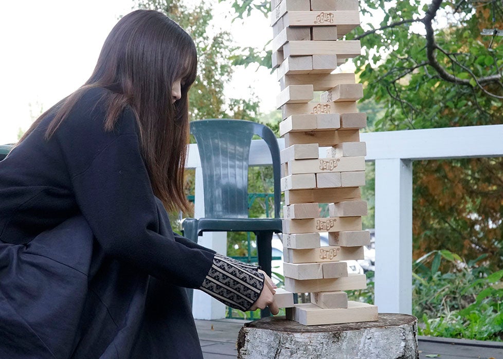 テラス席では、巨大ジェンガで遊ぶことができます。積み上げていくワクワクはもちろん、倒れるときの迫力が満点!どれだけ高く積み上げられるか挑戦してみませんか?