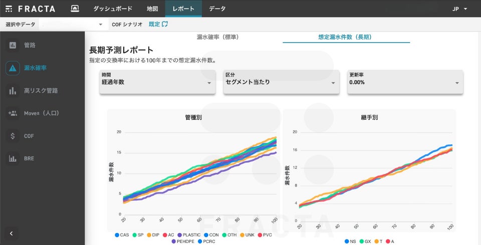 インフラ老朽化の社会課題に対して、AI技術を用いて評価した地下埋設配管の〝劣化度を可視化〟するサービスをメインに提供するFracta Japan株式会社(本社:東京都中野区、代表取締役:的場雄介)は、精緻かつ説明性の高いアセットマネジメント計画策定に活用可能な「更新基準年数シミュレーション」と、漏水調査を最適化する「漏水調査マップ」を新たに実装した。
