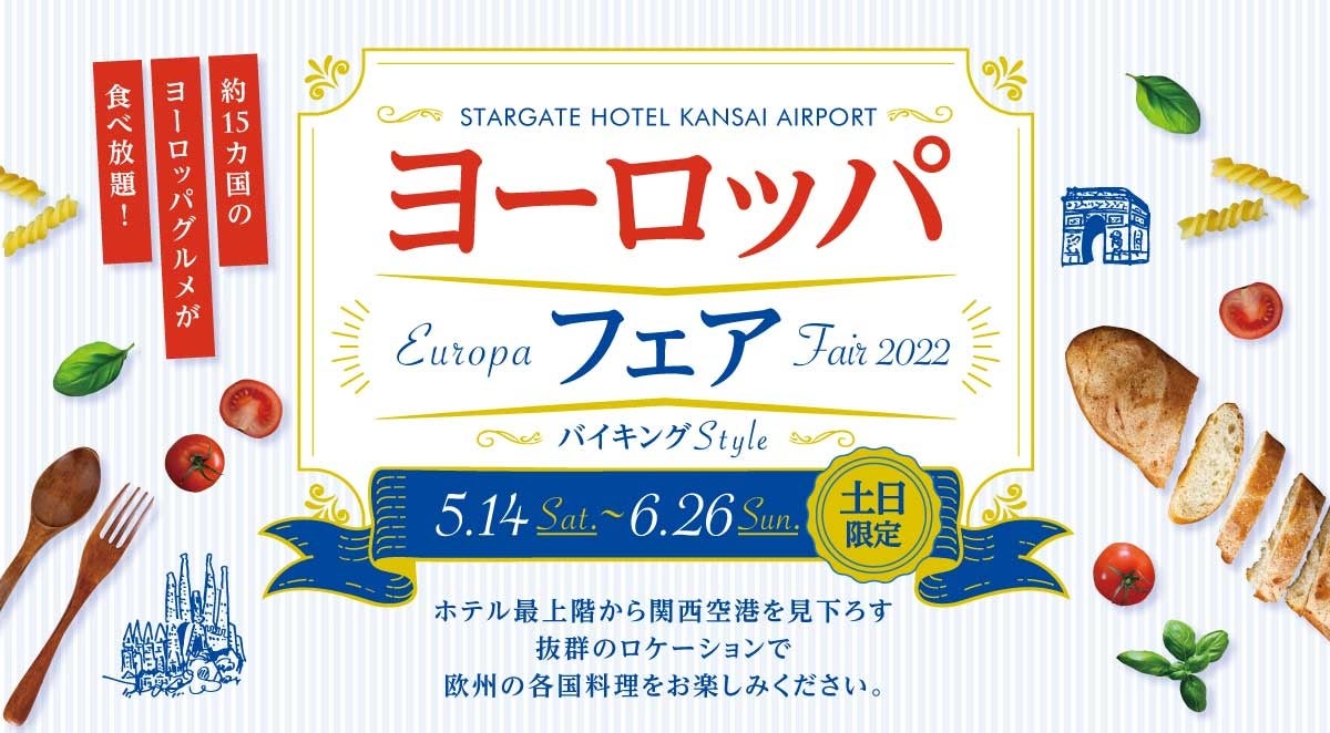 関西国際空港の対岸にある地上256mの超高層ランドマークタワー、スターゲイトホテル関西エアポート(所在地:大阪府泉佐野市りんくう往来北1番地)は、54階 ダイニング&バー「スターゲイト」にて、欧州の各国グルメが食べ放題の「ヨーロッパフェア」を2022年5月14日(土)~6月26日(日) の土・日曜日限定で開催いたします。イタリアのカプレーゼやトリッパのトマト煮込み、スペインのトルティージャやパエリア、イギリスのフィッシュアンドチップスなど約15か国のヨーロッパグルメが食べ放題。人気のシェフズコーナーでは焼きたてステーキ*や濃厚チーズリゾットをご提供いたします。また、ティラミスやタルトシトロンなどのヨーロッパ伝統スイーツもお薦めです。