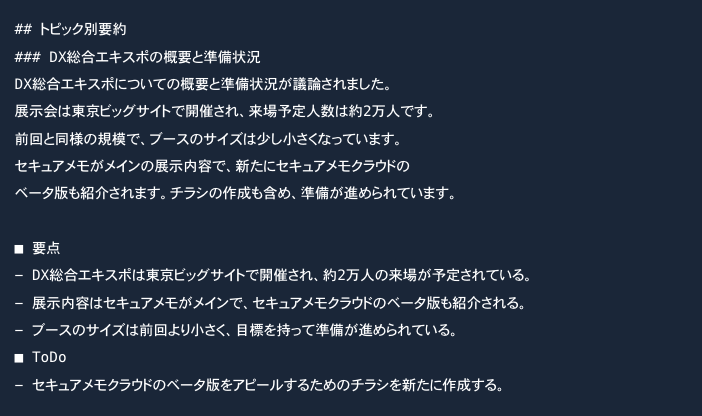 SecureMemoCloudでは、生成AIを活用し、会議録に特化した形式の要約を提供しています。