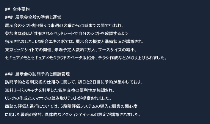 全体要約は会議に参加していない人でも、まず文字起こし結果全体の概略をつかめるように設計された要約です。少ない分量ながら、具体的な場所や時間などの重要な情報を落とさないように設計されています。