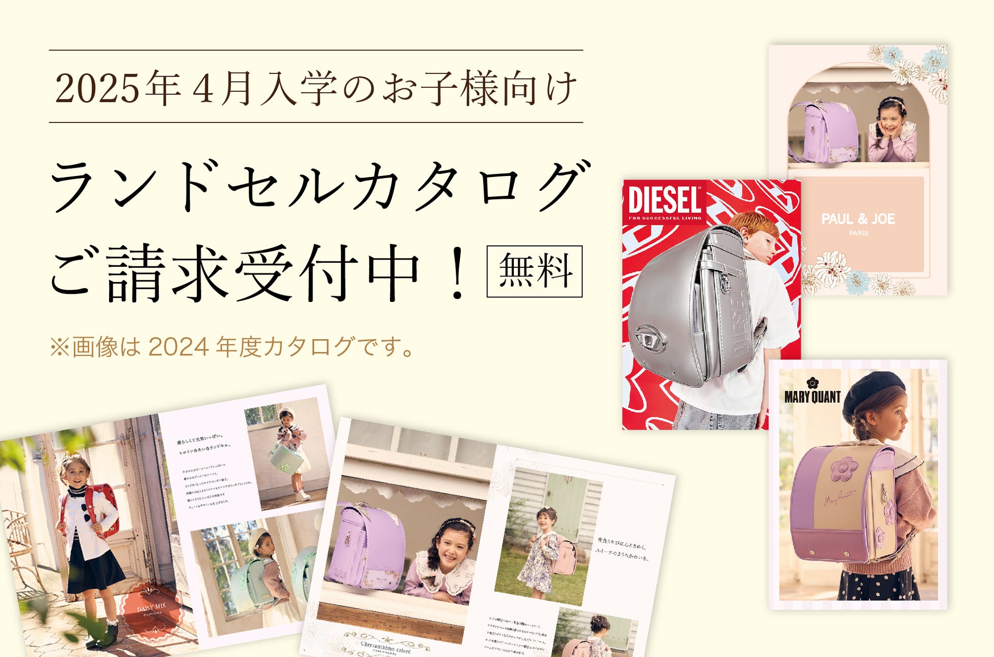「PAUL & JOE」や「DIESEL」などの人気ランドセルのカタログを、ブランド毎にご用意