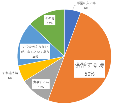 在宅で家族と接する機会が増えて、口臭が気になるようになった方が半数以上になりました。また、会話するときはもちろん、いつか分からないがなんとなく臭うという回答も多いため、面と向かっていない時にでも、口臭ケアをすることが大切だとわかりました。