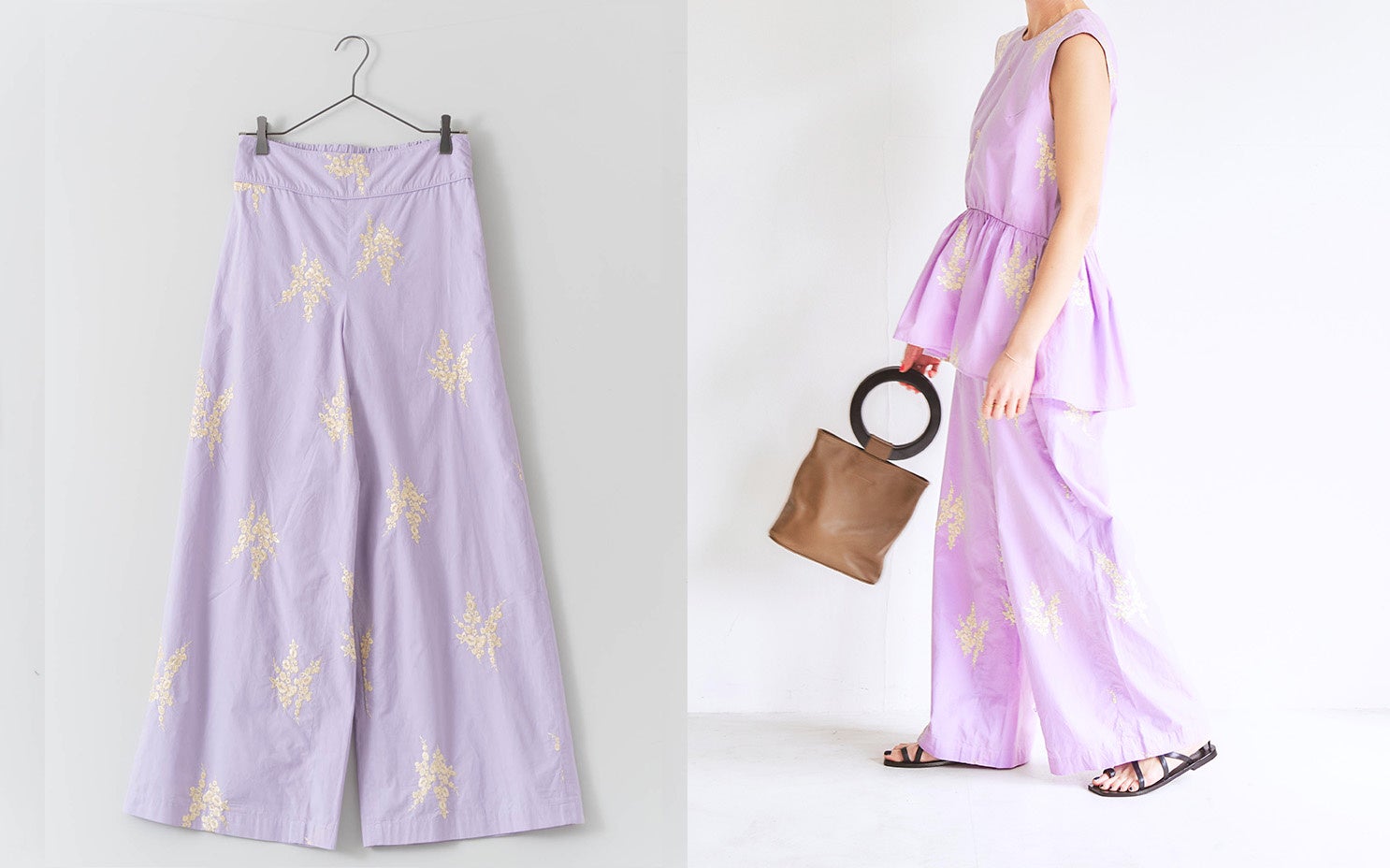 〈COTTON POPLIN EMB PANTS (LILAC) ¥28,600〉