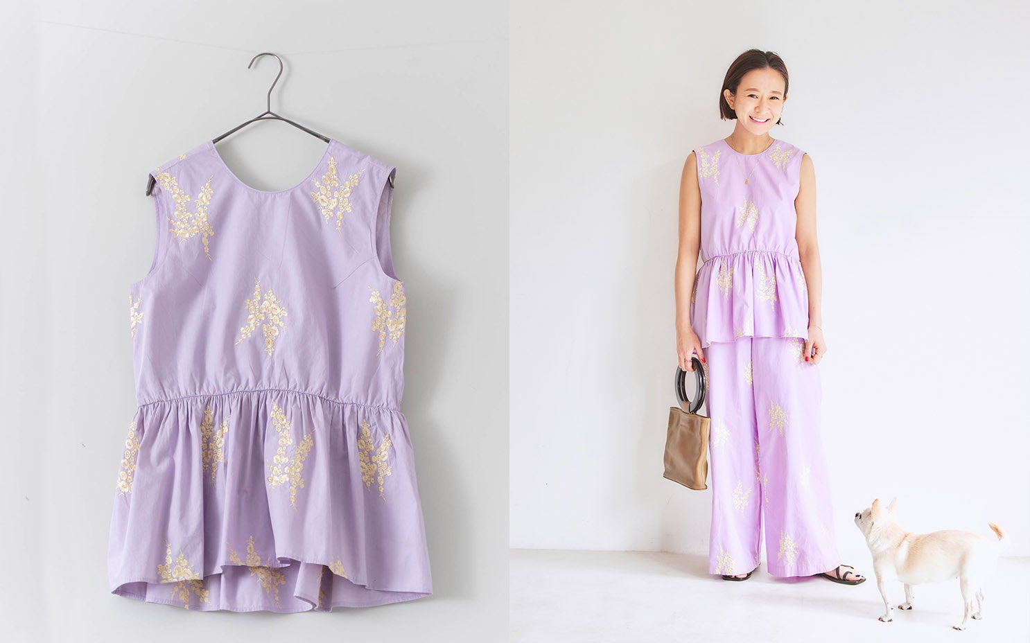 〈COTTON POPLIN EMB SLEEVELESS TOP (LILAC) ¥22,000〉