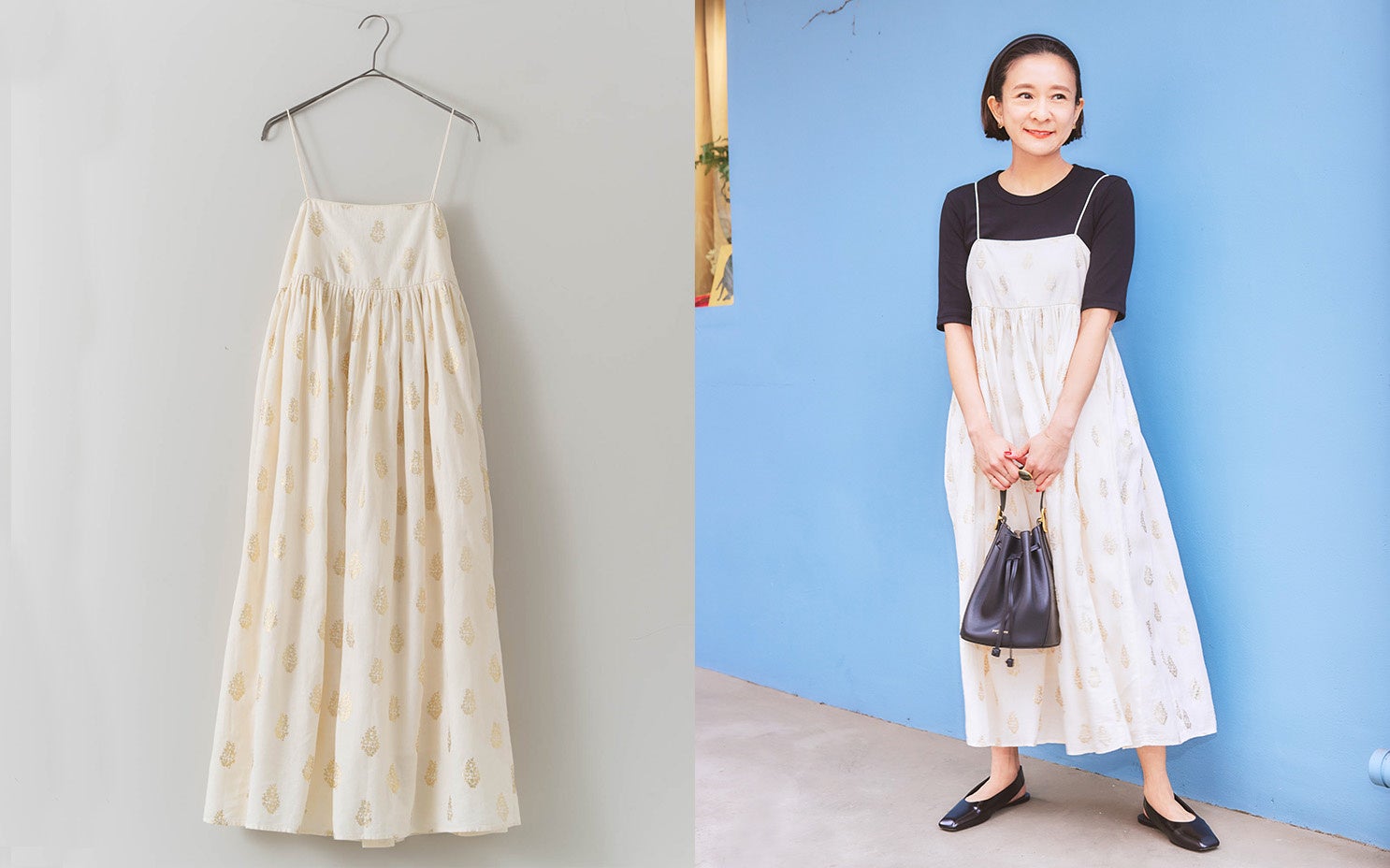 〈COTTON LINEN FOIL PRINT STRAP DRESS (ECRU) ¥30,800〉