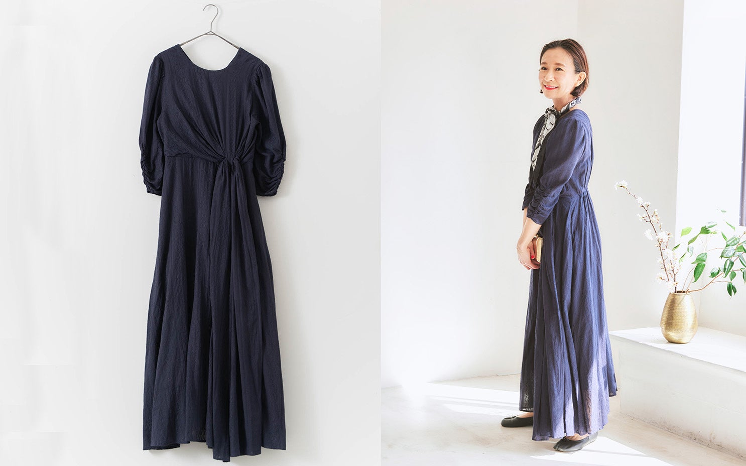 普段あまり派手な服を着ることがない方へオススメしたいドレス。今回のコラボレーションのために染めたオリジナル生地のネイビーには、特別にゴールドカラーのステッチを施しています。
