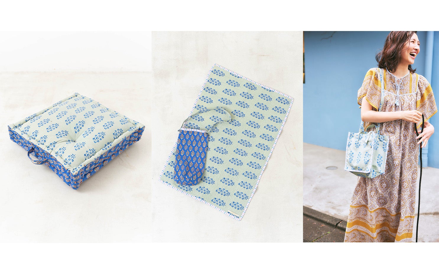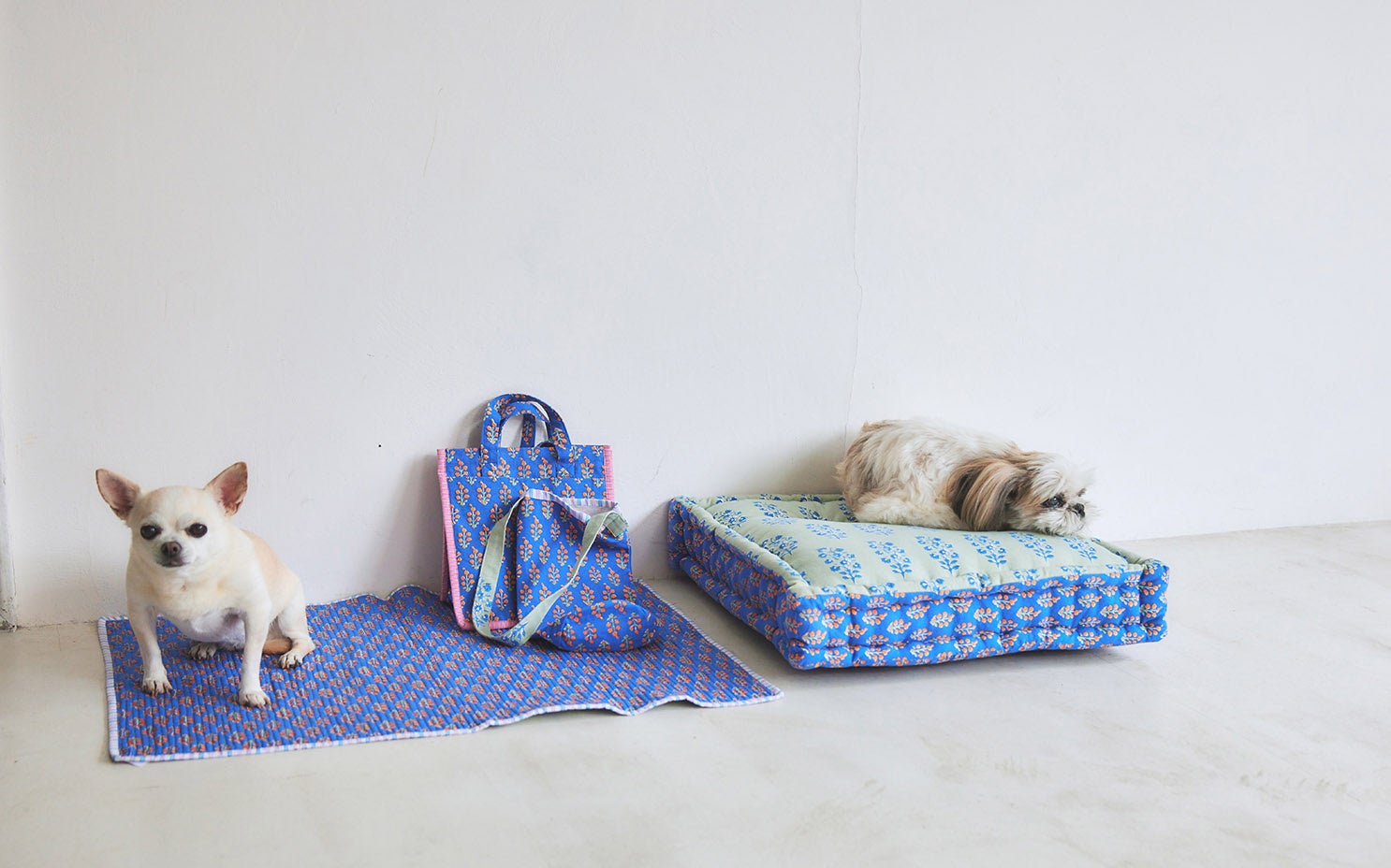 今回、浜島さんが愛犬家ということで、 ne Quittez pasの生地を使ってペット用グッズも製作。愛犬ピピちゃんがどこでもくつろげるように持ち運び可能なクッションと、カフェや出先で使えるバッグとマットのセットという、愛犬家なら誰もがうれしいラインナップ。