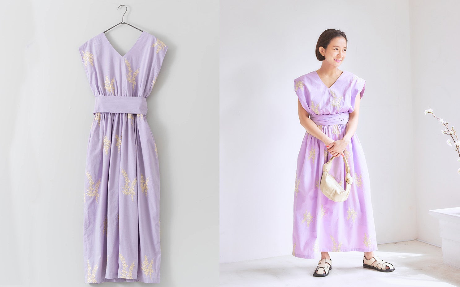 〈POPLIN FLOWER EMB V NECK DRESS (LILAC) ¥33,000〉