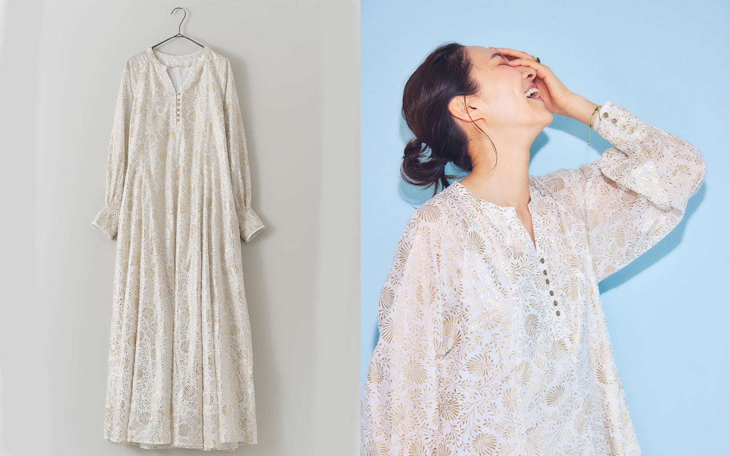 インドのコットンリネンを使用した着心地の良さ、身体のラインが綺麗に見える美シルエット、 両方が叶うデザインにこだわりました。 華やかな印象の箔プリントを施し、モダンさをプラス。