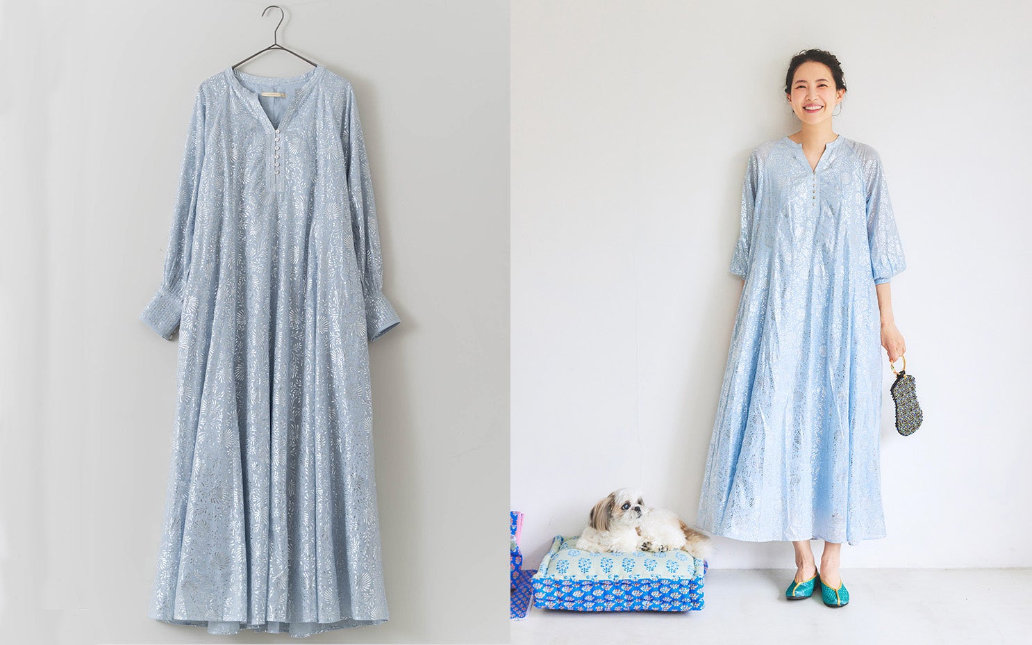 華やかながら着ていくごとに箔が馴染む生地を上品なデザインに落とし込み、大人の雰囲気を持つワンピースが出来上がりました。淡いブルー×シルバーはこのコラボレーションのために作られた生地です。