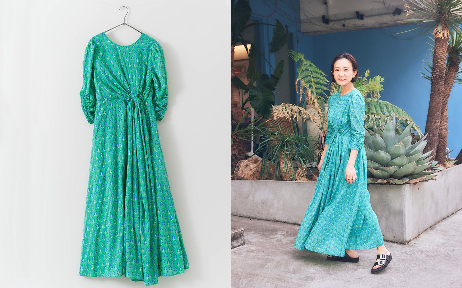 〈COTTON VOILE ETHNIC PRINT TWISTED WAIST DRESS (GREEN) ¥28,600〉