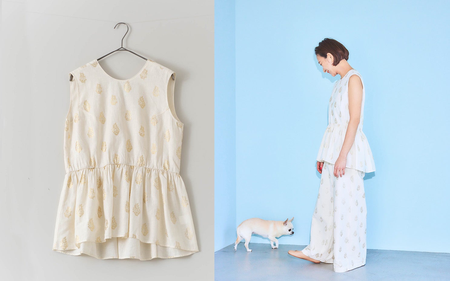 〈COTTON LINEN FOIL PRINT SLEEVELESS TOP (ECRU) ¥19,800〉