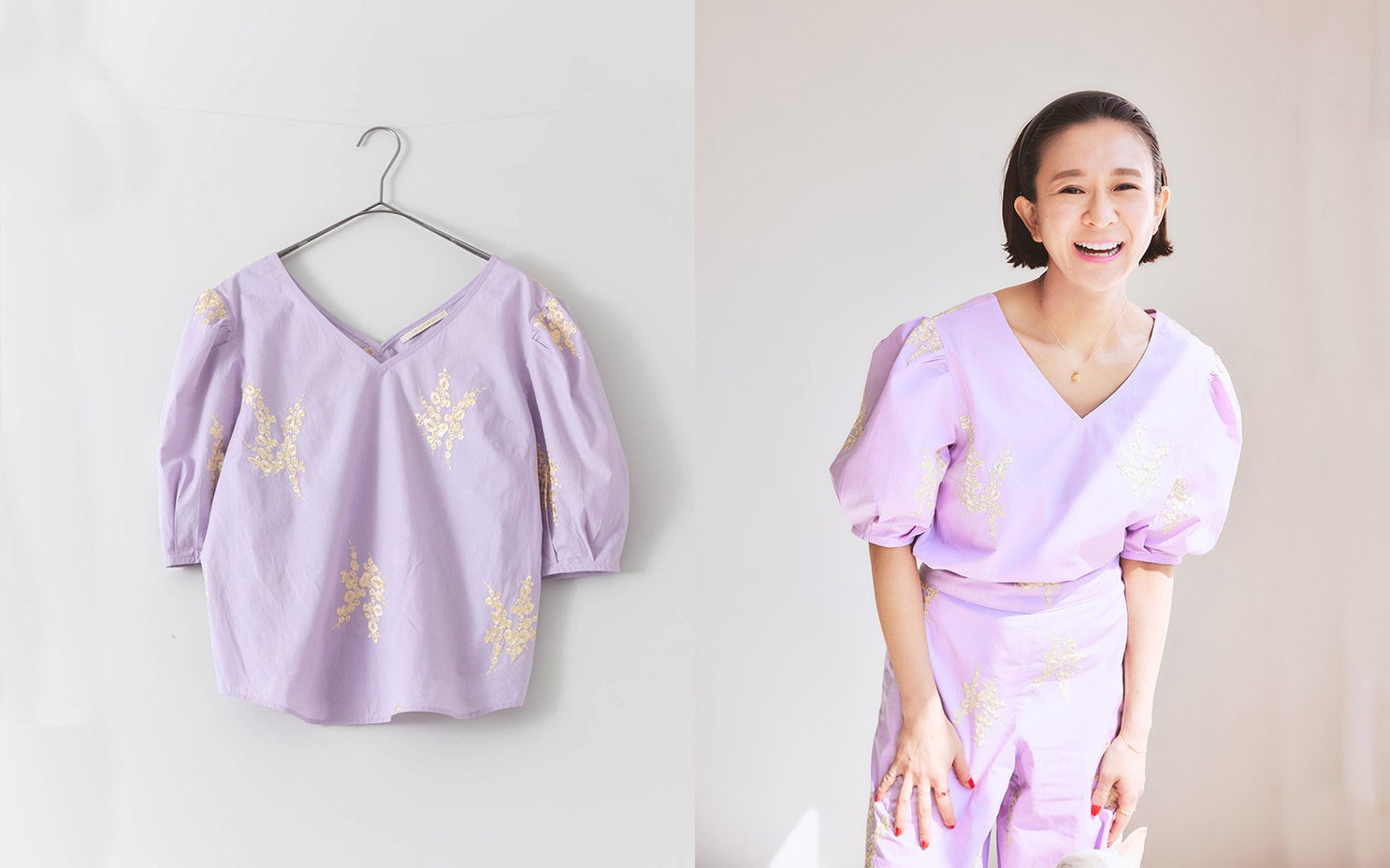 〈POPLIN FLOWER EMB V NECK TOP (LILAC) ¥26,400〉