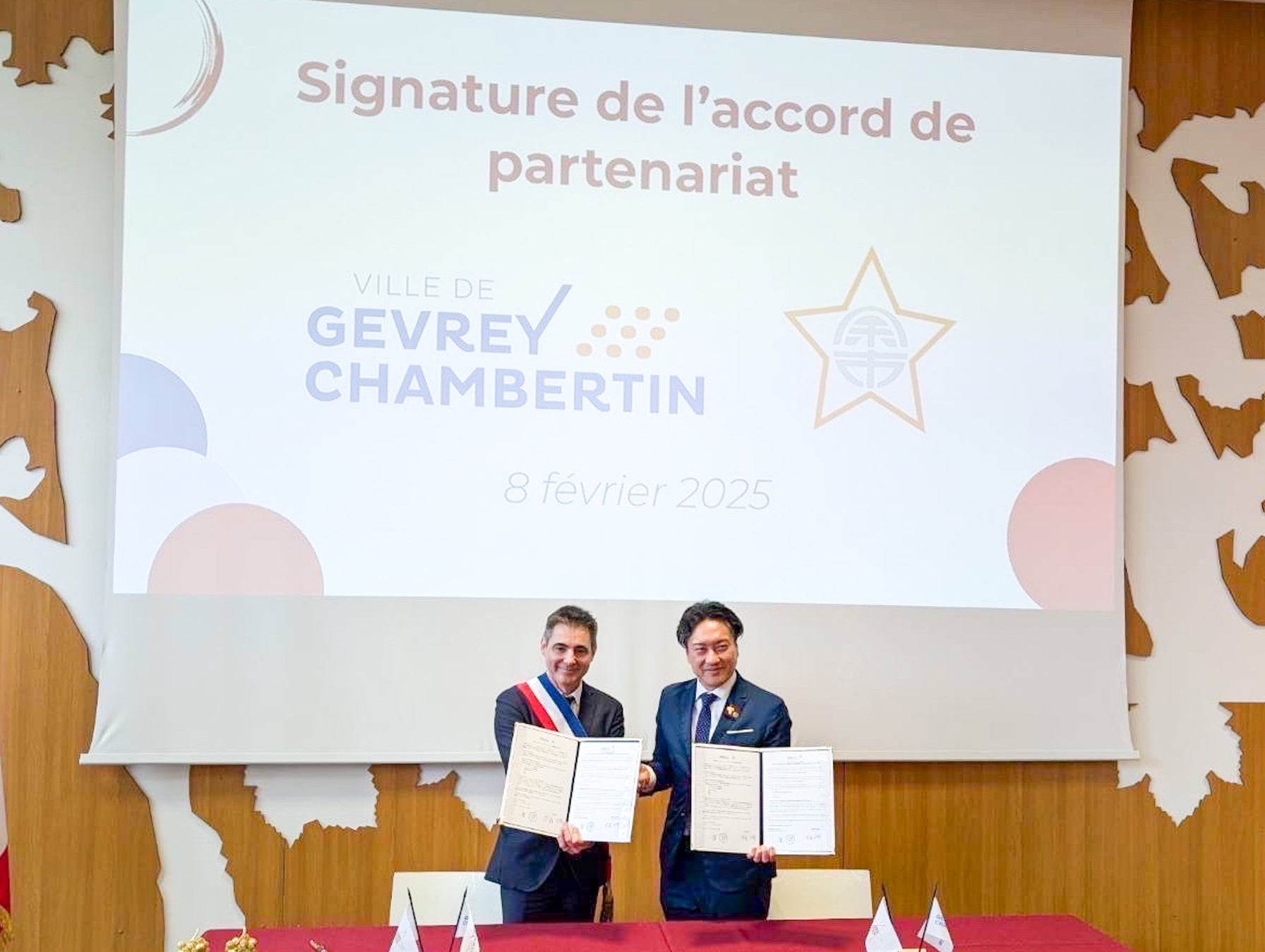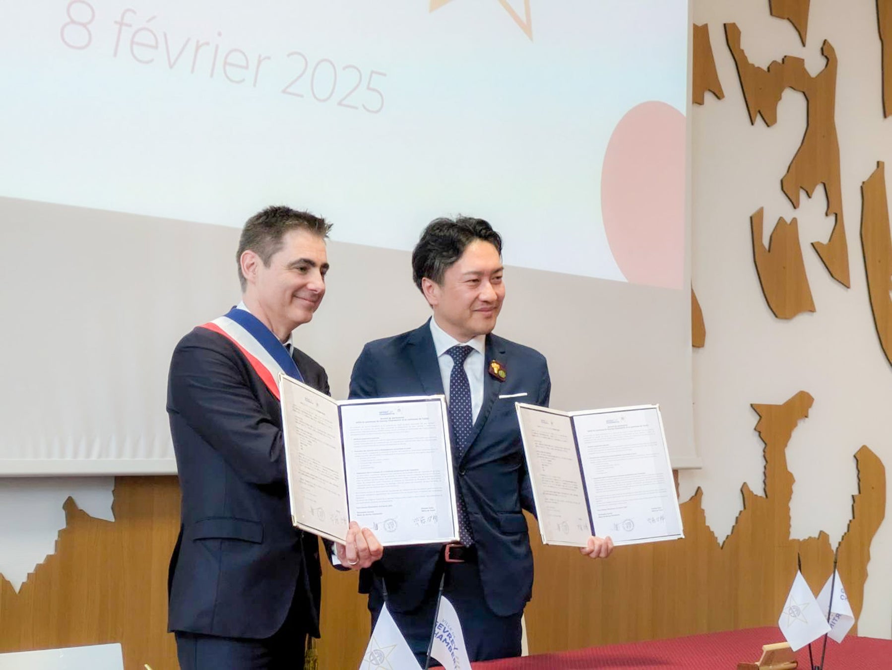 2025年2月8日(フランス現地時間)、北海道余市町(町長:齊藤啓輔)とフランス・ブルゴーニュ地方のジュヴレ・シャンベルタン村(村長:クリストフ・ルカンド)が、親善都市協定を締結しました。この協定は、両地域の共通点であるワイン産業を軸に、文化・観光・経済分野での交流を推進し、地域の発展を目指すものです。協定締結式は、フランスのジュヴレ・シャンベルタン村にて開催され、日本ワインの国際的なプロモーションイベント「サロン・デ・ヴァン・ジャポネ」およびブルゴーニュ大学主催のシンポジウムの場で執り行われました。