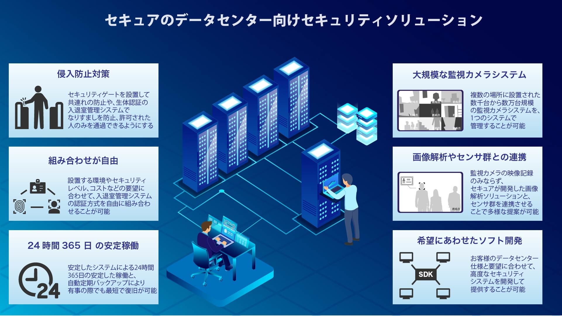 セキュアではデータセンターに求められる必須要件を満たした監視カメラソリューションのご提案が可能です。