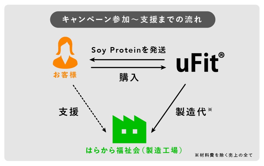 uFitはこの活動を後押しするために、お客様が「uFit Soy Protein」を購入することで、障がいのある方の継続的な雇用創出と賃金向上につながるキャンペーンを立ち上げました。