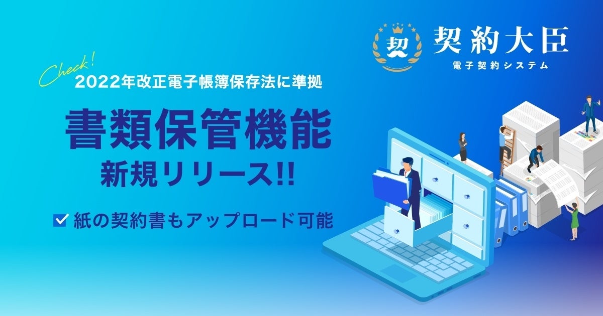 株式会社TeraDox(本社:東京都渋谷区、代表取締役:齋藤 啓司)は、中小企業、フリーランス・個人事業主の契約に特化した電子契約システム『契約大臣』において、2022年1月1日から施行された改正電子帳簿保存法に準拠した書類保管機能をリリースいたします。