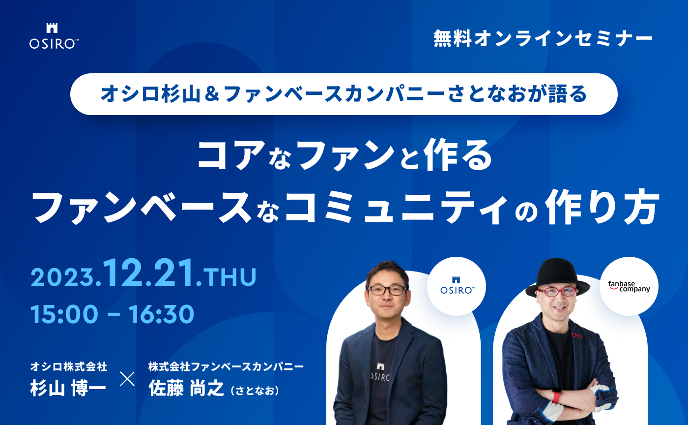 12月21日(木)「ファンベース」の著者、佐藤尚之(さとなお)氏とオシロ代表杉山のオンラインセミナーを開催。コミュニティ疲れをしないコアファンとの長期的な関係づくりとは。