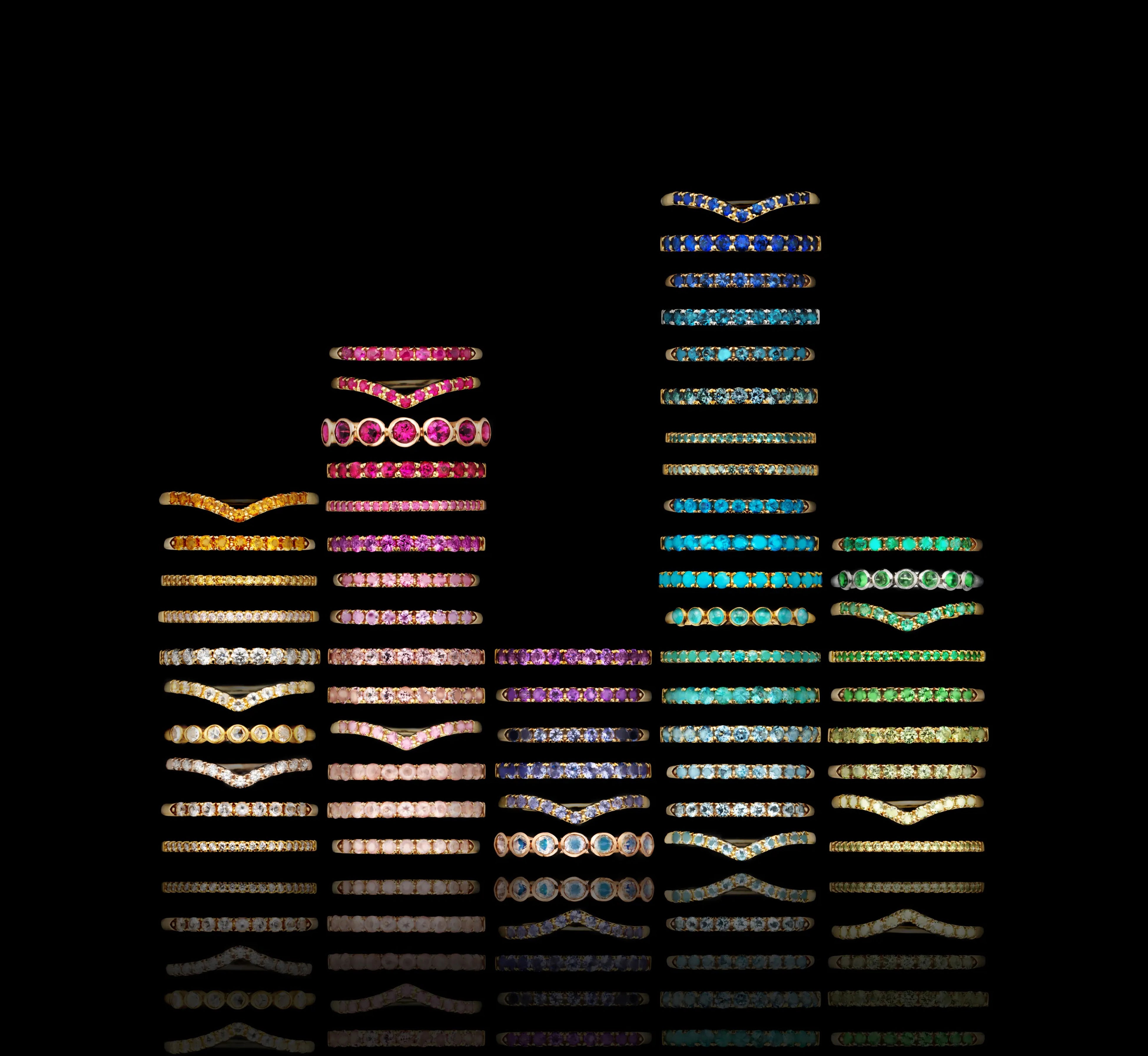 イベントでは、ビズーが揃える「カラー・エタニティ」全種類が集まります。色、太さ、シルエット、地金の組み合わせで、選べるリングの種類は約150種類。全5種類のデザインに、多彩な宝石と地金を掛け合わせることで、圧巻の数が揃います。