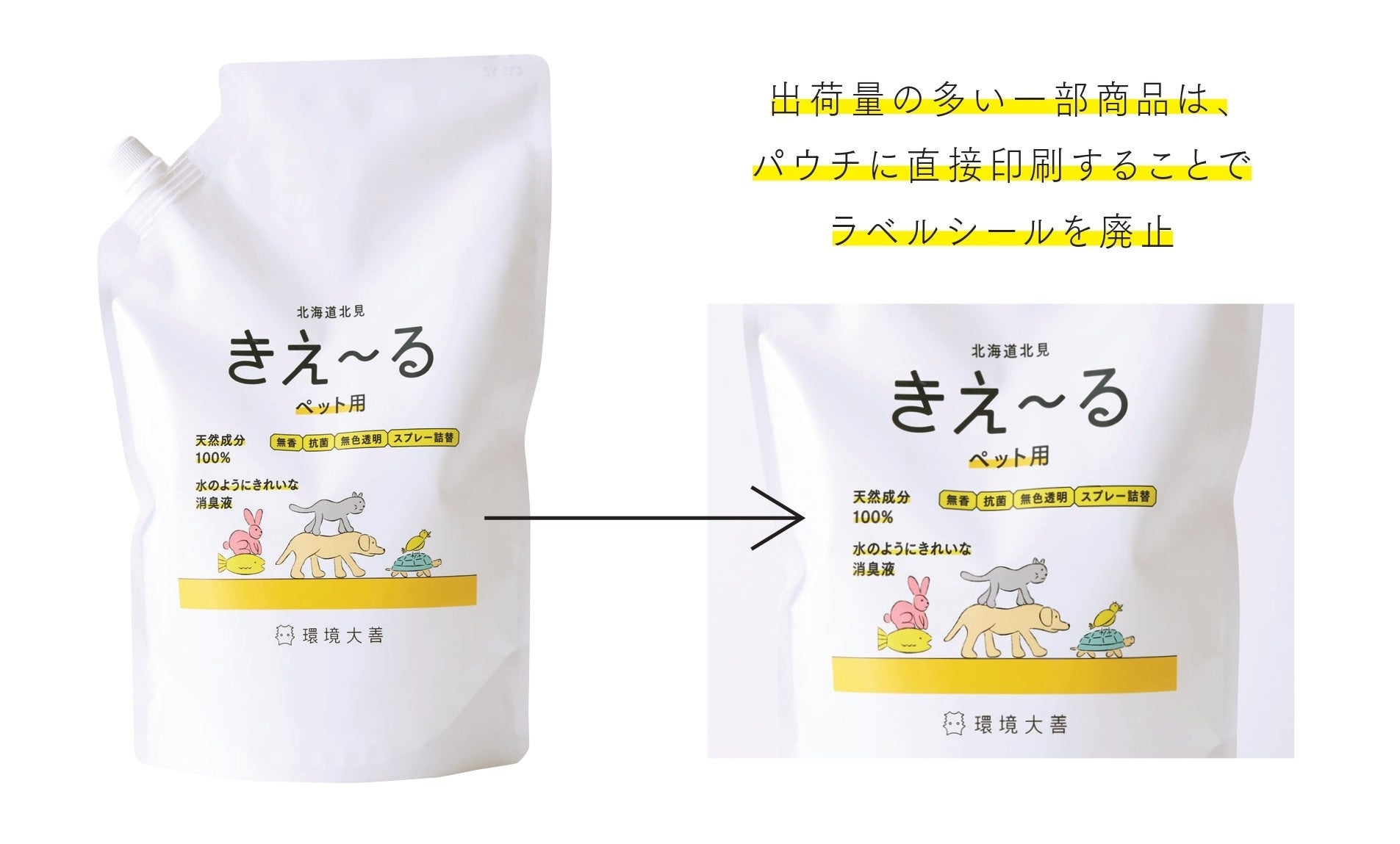 環境大善株式会社(本社・北海道北見市)は天然成分100%の消臭液「きえ〜る」シリーズ詰替用について、一部の容器をボトルタイプからパウチタイプへと変更いたします。容器を変更することでプラスチック量を最大71%削減して、環境に配慮したモノづくりを推進いたします。
