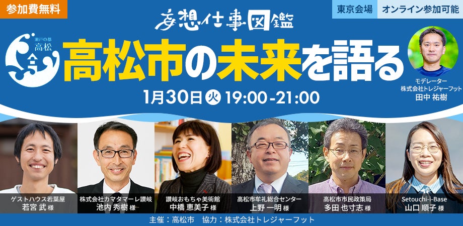この度、株式会社トレジャーフットでは、高松市「令和5年度高松市大都市圏における関係人口コミュニティ開設・運営業務委託」を受託し、1月30日(火)に「知ればもっとオモシロくなる「妄想仕事図鑑」香川県高松市の未来を語る、豪華ゲスト6名による未来会議!」を開催いたします。