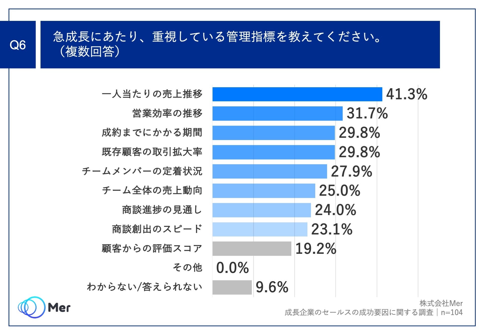 「Q6.急成長にあたり、重視している管理指標を教えてください。(複数回答)」(n=104)と質問したところ、「一人当たりの売上推移」が41.3%、「営業効率の推移」が31.7%という回答となりました。