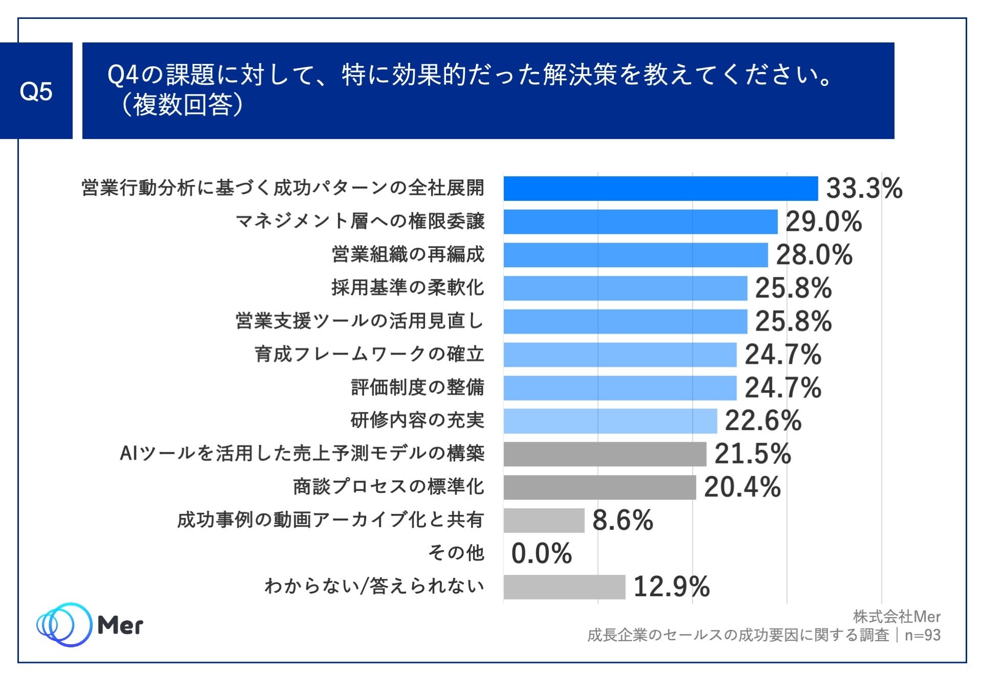 Q4で「特にない」「わからない/答えられない」以外を回答した方に、「Q5.Q4の課題に対して、特に効果的だった解決策を教えてください。(複数回答)」(n=93)と質問したところ、「営業行動分析に基づく成功パターンの全社展開」が33.3%、「マネジメント層への権限委譲」が29.0%、「営業組織の再編成」が28.0%という回答となりました。