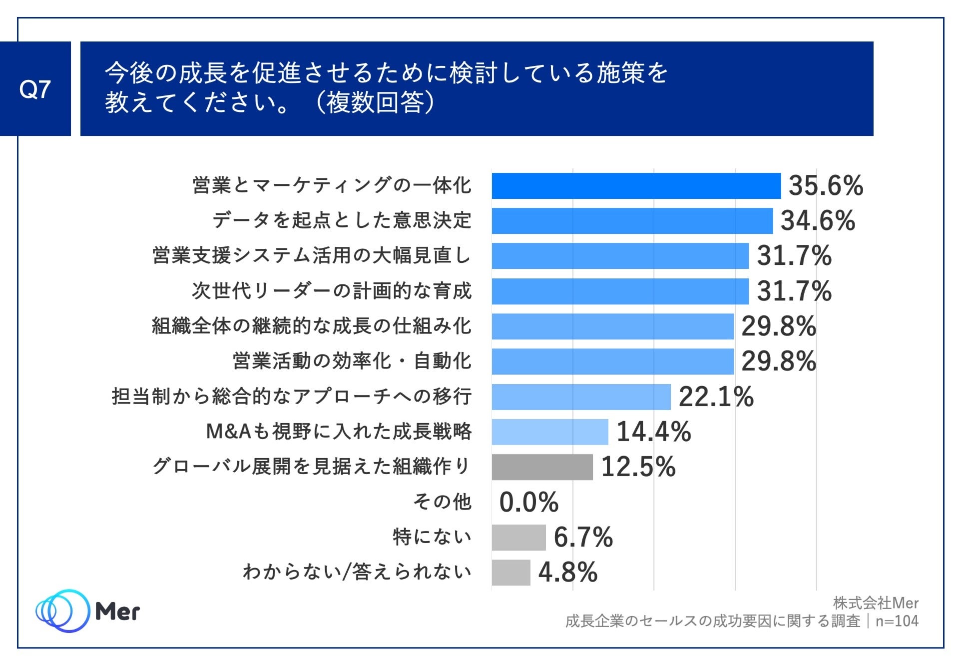 「Q7.今後の成長を促進させるために検討している施策を教えてください。(複数回答)」(n=104)と質問したところ、「営業とマーケティングの一体化」が35.6%、「データを起点とした意思決定」が34.6%という回答となりました。
