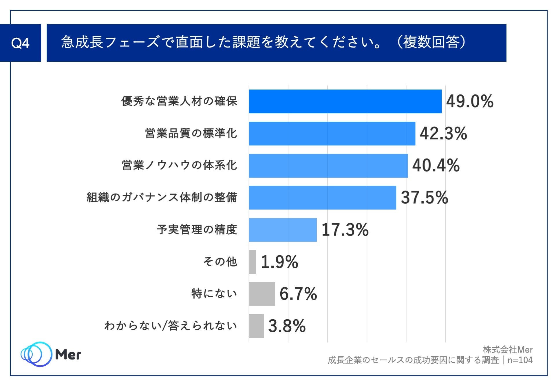 「Q4.急成長フェーズで直面した課題を教えてください。(複数回答)」(n=104)と質問したところ、「優秀な営業人材の確保」が49.0%、「営業品質の標準化」が42.3%、「営業ノウハウの体系化」が40.4%という回答となりました。