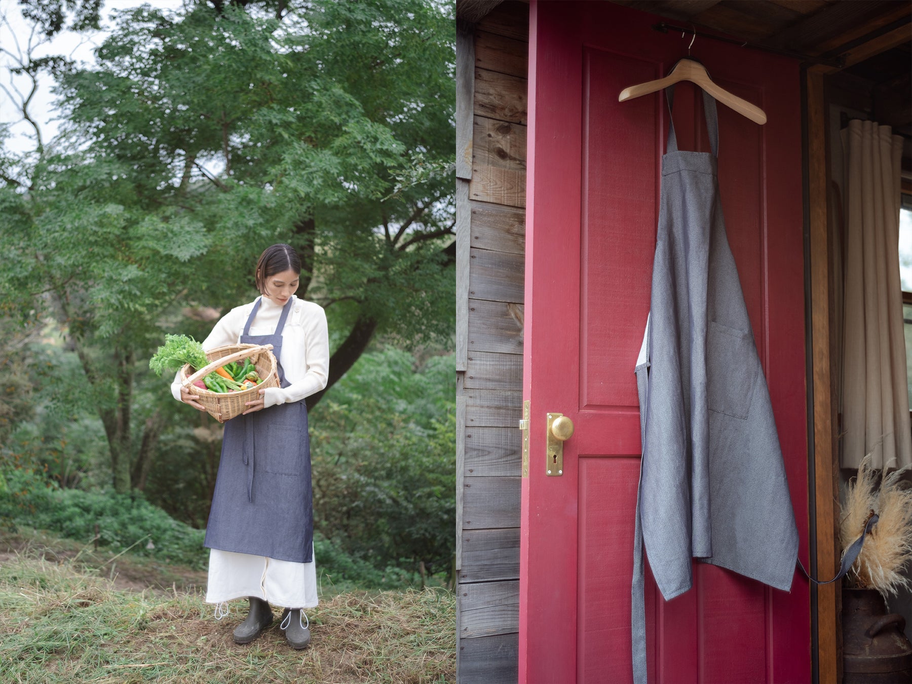 同じく「和紙デニム」を使用したシンプルなエプロン。和紙は吸水性・速乾性に優れているので、お料理や家事のときにも大活躍。ざっくり被って様になる絶妙なカッティングに仕上げています。
