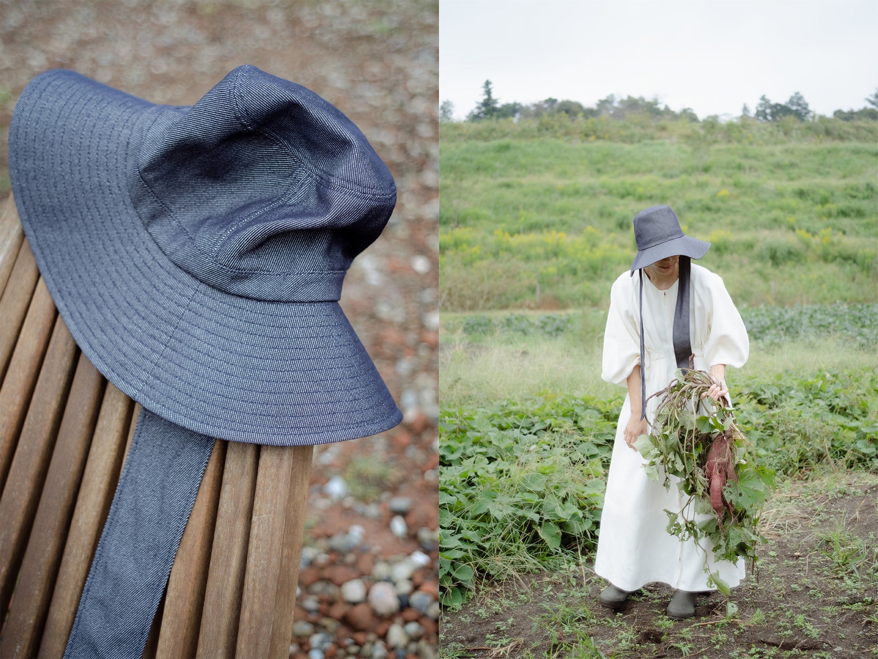 「和紙デニム」を使用したエレガントなシルエットのハット。形をキープするハリ感がありながら、触り心地はとても柔らかく頭にフィットしてくれます。首までしっかり覆う大きめのつばなので、日除け効果もバッチリ。幅広のリボンはふんわり垂らしたり、首元でキュッと結んだり、お好みでスタイリングしてみてくださいね。