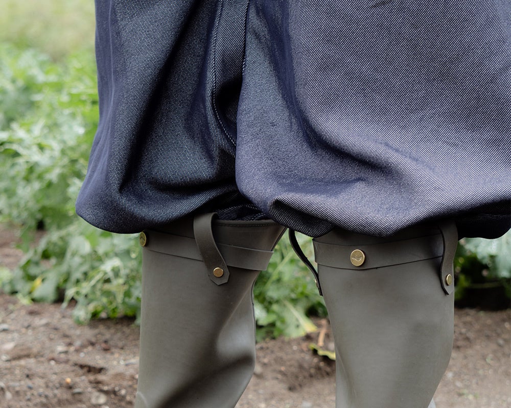 股下のボタンを付け外しすることで、パンツスタイル・スカートスタイルの切り替えが自在なアイテム。 思いっきり畑仕事や庭仕事をしたい時は、足を包むようにボタンを止めてパンツスタイルに。エレガントにピクニックやランチを楽しみたい時は、前身頃同士、後身頃同士でボタンを止めてスカートスタイルに。
