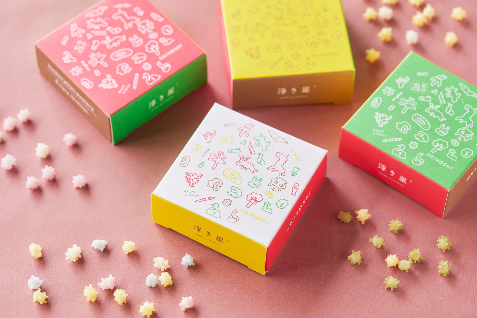 このままでは絶滅してしまうのではと私たちは勝手に心配しました。なんとか後継を作るべく全国のまだ知らない人達に向けて魅力がしっかり伝わるように想いを文字とデザインを活用し新しいブランドとして誕生したのが「浮き星」です。星のような可愛い形と、お湯に浮いてくる飲めるお菓子という珍しい特徴をを合わせ「浮き星」®︎という名称になりました。このような地理的背景や歴史を感じつつお楽しみいただけますと幸いです。