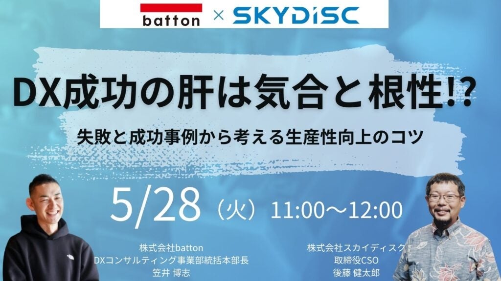 また2024年5月28日(火)11:00より、株式会社スカイディスク様との共催ウェビナー「DX成功の肝は気合と根性!?失敗と成功事例から考える生産性向上のコツ」を、それぞれ開催します。