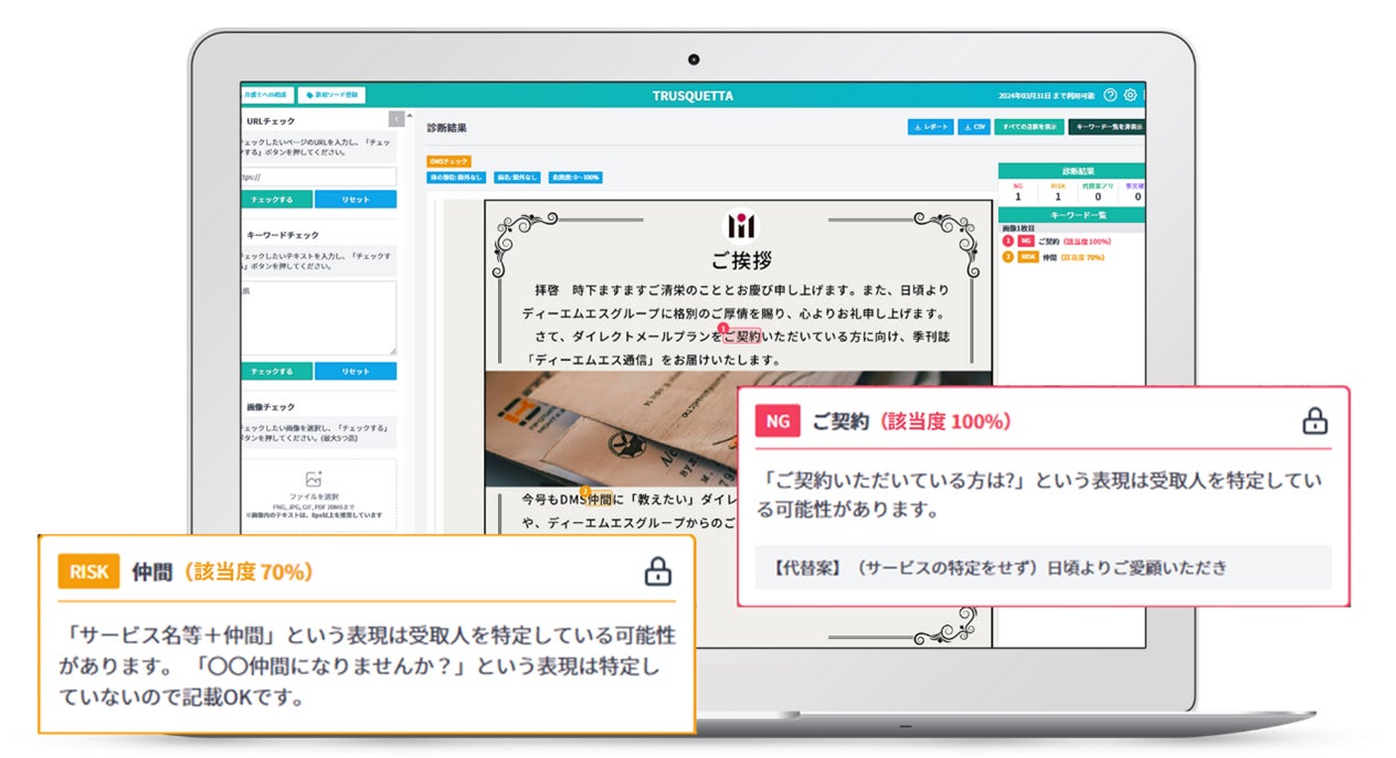 「TRUSQUETTA(トラスクエタ)Letter」(以下本ツール)は、ダイレクトメール(以下DM)の画像データをアップロードするだけで、郵便法及び信書便法に規定されている信書の表現をAIが自動で識別し、該当する可能性や代替文言の提示を瞬時に行ってくれるクラウド型システムです(※1)。