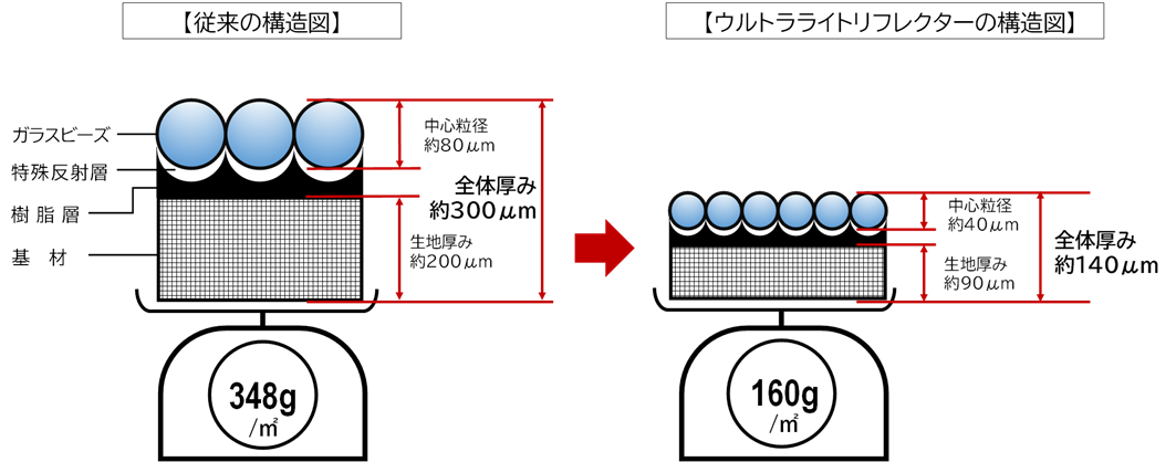 2022年9月に発売した「Ref Lite ウルトラライトリフレクター」(特許申請中)は、半導体向けの精緻な製造技術を有する当社と、超軽量糸の製造技術を誇るカジレーネ株式会社(本社:石川県かほく市 代表取締役社長 梶 政隆)の技術を合わせて共同開発した、極薄軽量クロスです。従来のものと比較して体積比25%で製造が難しいとされていた40μmのガラスビースと、極細で超軽量糸を採用したことで、0.09mmの極薄かつ世界最軽量※1のリフレクターが誕生しました。
