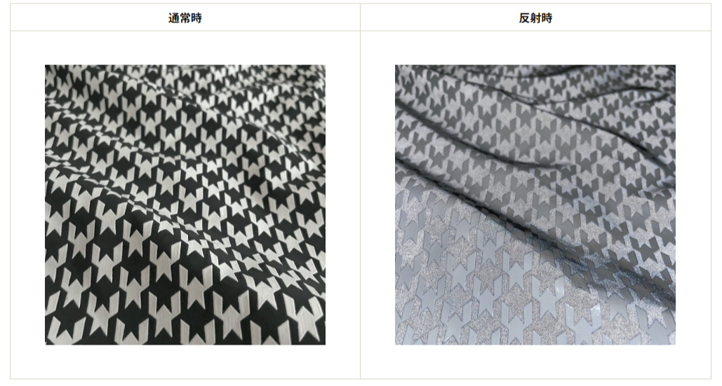 表面に特殊な立体加工やカラー処理を施せるため、リフレクターでありながら、立体模様による独特の風合いや刺繍柄のようなデザイン、ジャガード生地のような質感の表現ができるようになりました。また、軽く柔らかい質感の生地は、従来のリフクレターのようなごわつきを感じさせず、ジャケットやブルゾン、スカーフといった幅広いファッションアイテムに活用いただけます。リフレクターならではの暗闇で光る特徴とともに、立体感のある幅広い表現をお楽しみください。
