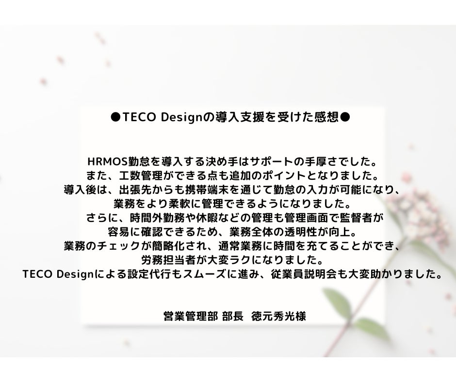 専任の担当者が一人しかおらず通常業務に追われていたため、自社での導入にかかる時間が割けない状況でした。外部のサポートが必要と判断し、HRMOSからの紹介でプレミアム初期設定代行サポートを選択。TECO Designによる設定代行で、初期設定から運用までの導入作業がスムーズに進行しました。