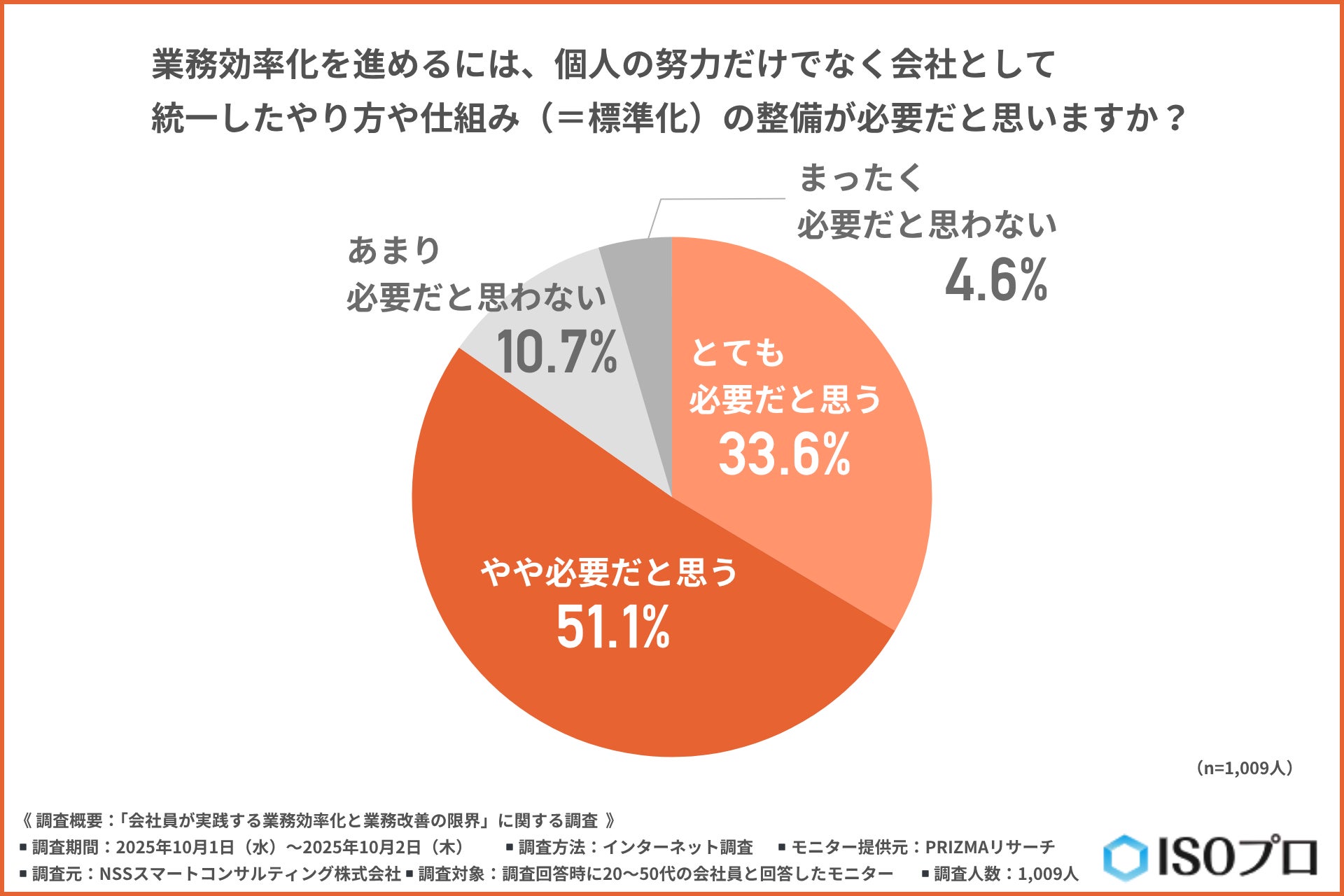 「業務効率化を進めるには、個人の努力だけでなく会社として統一したやり方や仕組み(=標準化)の整備が必要だと思うか」について尋ねたところ、約8割が『とても必要だと思う(33.6%)』『やや必要だと思う(51.1%)』と回答しました。