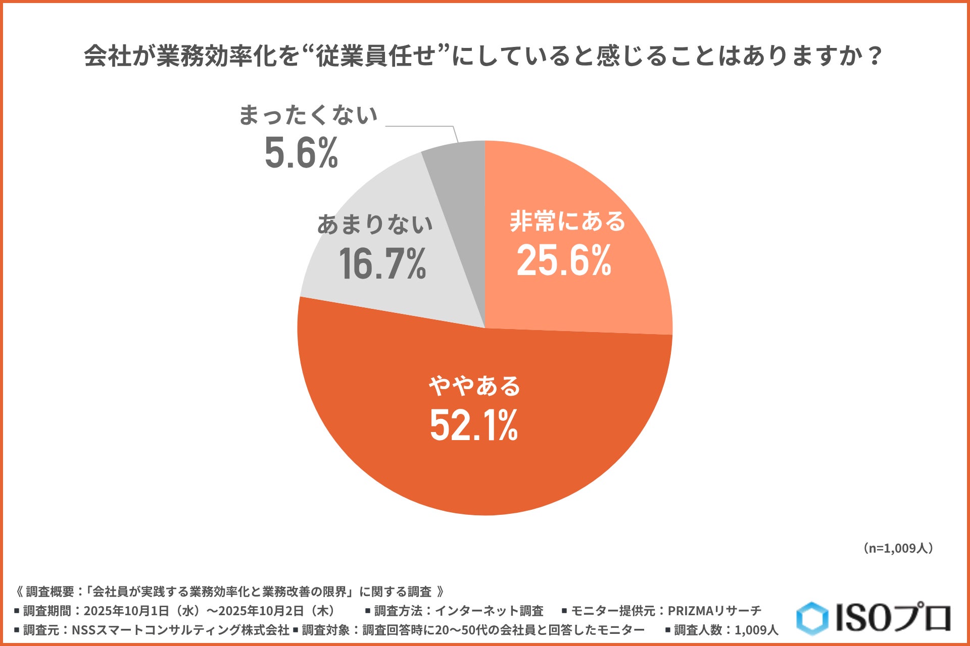 「会社が業務効率化を“従業員任せ”にしていると感じることはあるか」と尋ねたところ、約8割が『非常にある(25.6%)』『ややある(52.1%)』と回答しました。