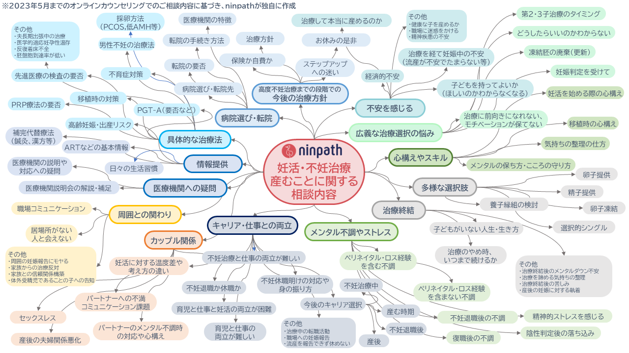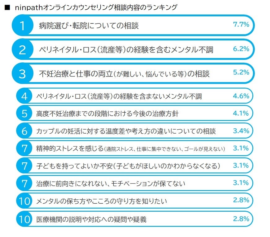 ninpathでは企業勤務経験や人事経験の豊富なキャリアカウンセラーによる企業側の視点も交えて具体的なアドバイスが得られ、利用者からも高評価を頂いている。4番目以降、治療関連では、高度不妊治療で治療が行き詰まっている方による今後の治療方針(追加の検査や手術等の治療を行うか、採卵をやり直すか等)の相談や、医療機関での説明や対応に対する疑問や納得ができなかったので教えてほしい、といった相談も多くあった。
