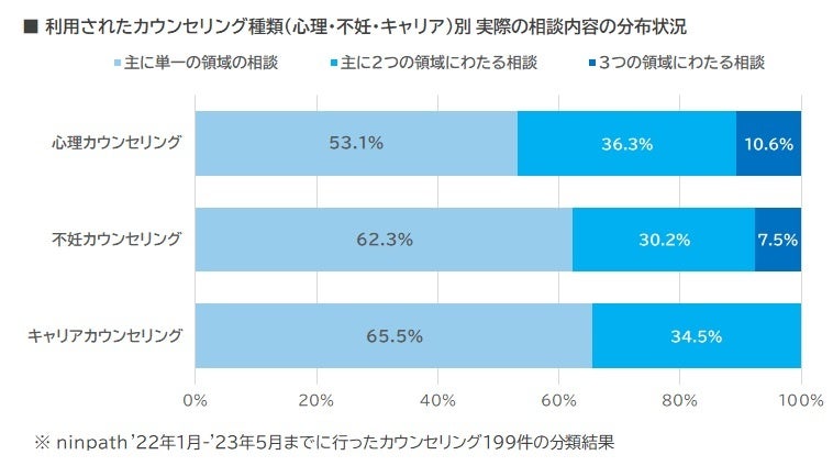 利用されたカウンセリング種類別では、心理カウンセリング利用の場合に相談内容が複数領域にまたがっている割合が約57%と最も高かった。キャリアカウンセリング利用の場合には複数領域にまたがるケースは34.5%と相対的に低かったものの、特に職場環境や両立の悩みに関連したメンタル不調などが多く見られた。
