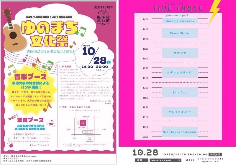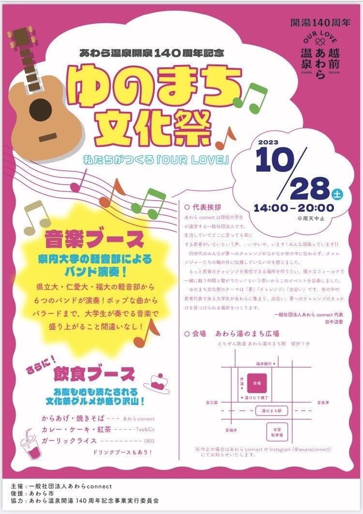 令和5年10月28日(土)、あわら温泉湯のまち広場で、一般社団法人あわらConnectが、地元福井県と隣県の大学生たちが作り上げる音楽ライブとグルメのイベント「ゆのまち文化祭」を開催します。
