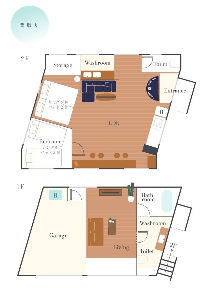 2階:【個室】シングルベッド2台【LDK】セミダブルベッド2台