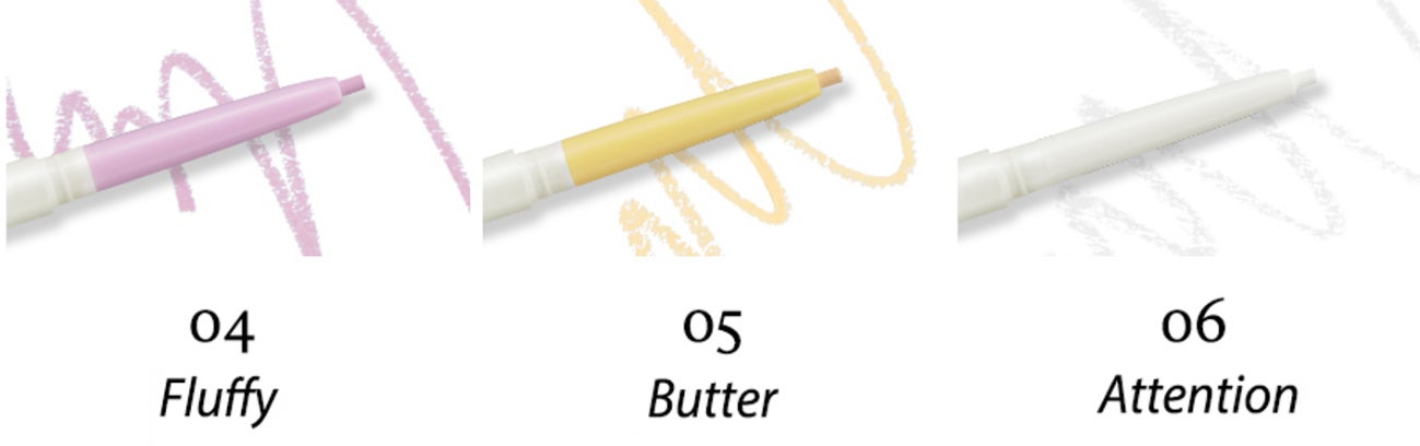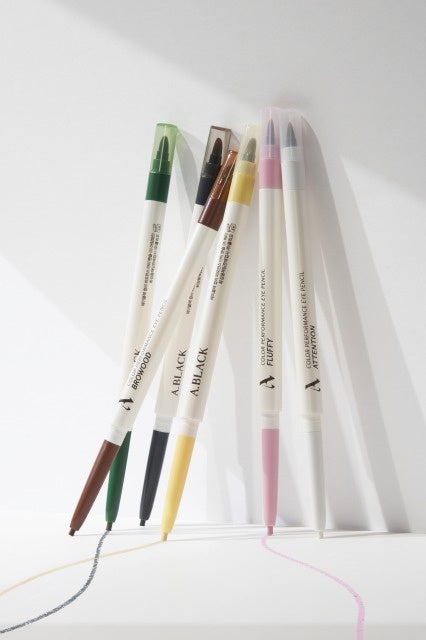 インパクトの高いアイテムを次々と発表し話題の「エーブラック」からは、「カラーパフォーマンスアイペンシル」が新登場しました。デイリーな色遊びを提案する6色は、ソフトブラック・ディープブラウン・カーキ・ピンク・イエロー・ホワイトで構成。シャープナーとブラシのデュアルツールで、細いラインが必要な時はシャープナーで、目尻などブレンディングしたい時はブラシで、メイクに合わせて選択可能です。フィルムフォーミュラで長時間滲まず、美しいラインが持続します。