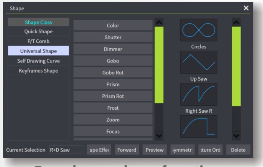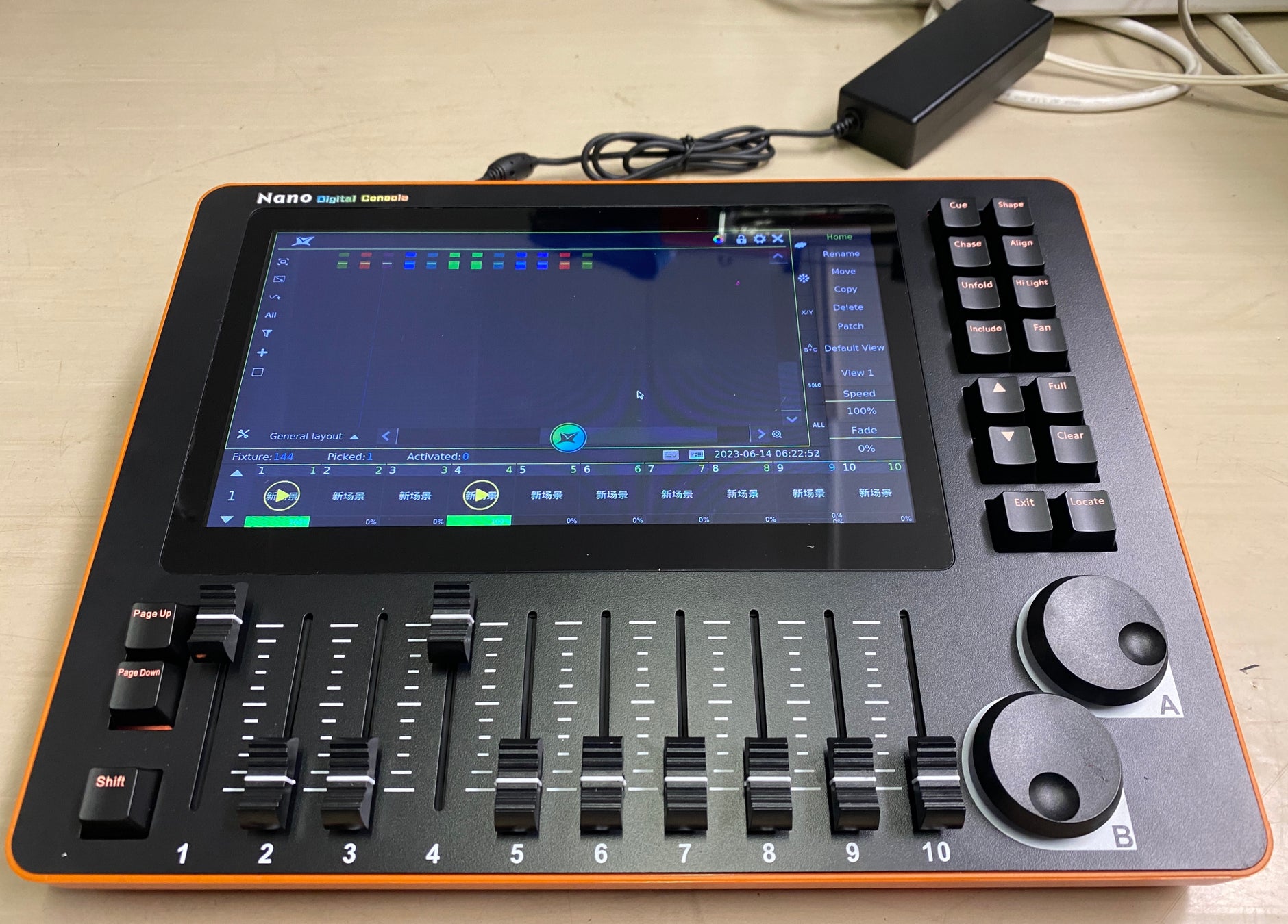 Advanced Controls : Built in RGB&CMY palette, support edit fixture order, attribute time parameter Playback:10 playback faders, 50playback pages, up to 1500playback