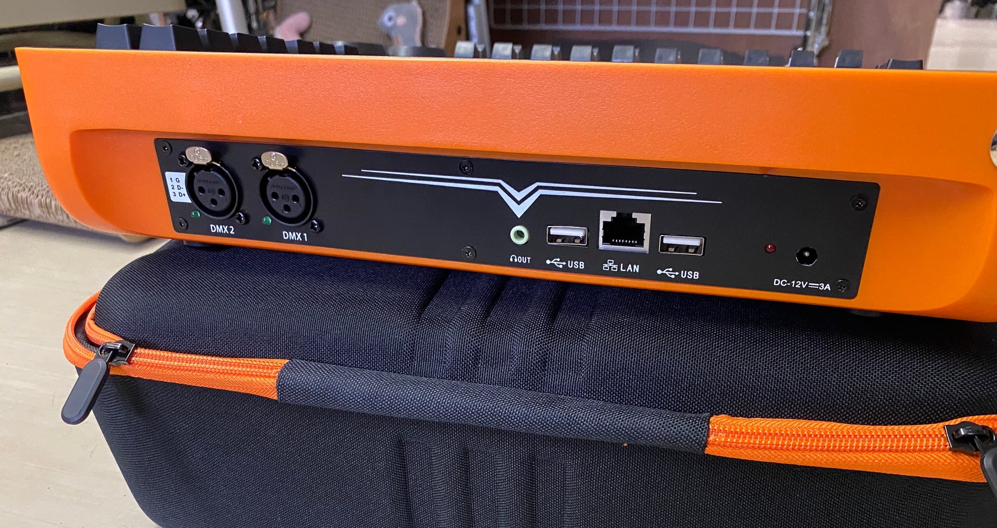 背面は、DMX端子出力2系統(1024チャンネル)USB2ポート LANポート 音声出力端子 ACアダプター