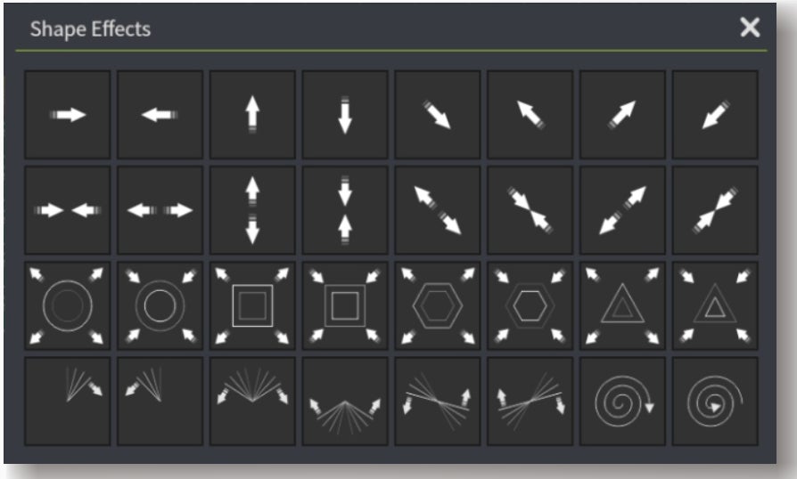 Shaps : Abundant shapes effect, shapes effects, pixel mapping, key frame shapes, homemade shapes. Sport multiple shapes superposition operation