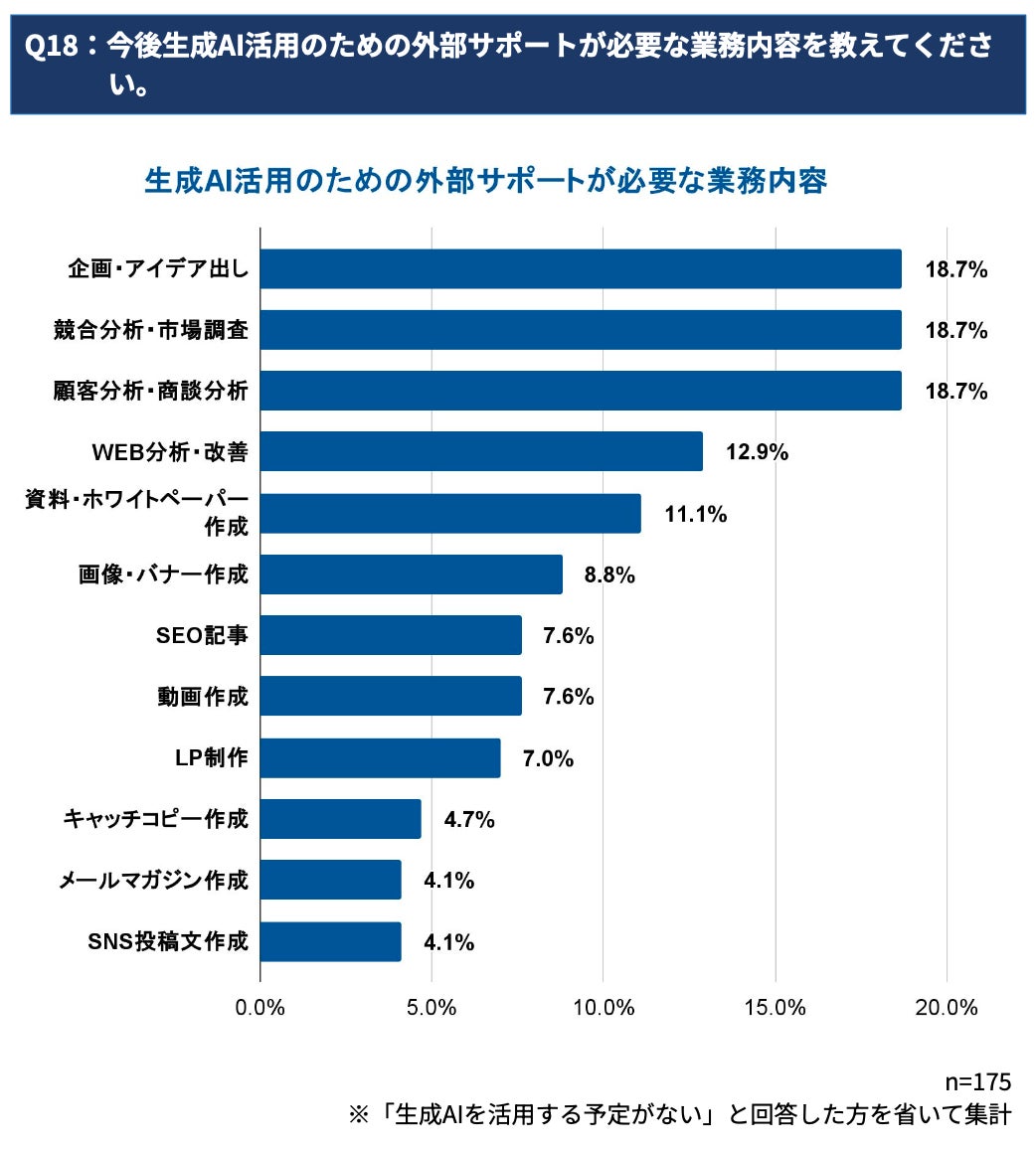 外部サポートのニーズが高い業務は、自社だけでは難しい「企画・アイデア出し」「競合分析・市場調査」「顧客分析・商談分析」で、それぞれ18.7%と同率トップでした。
